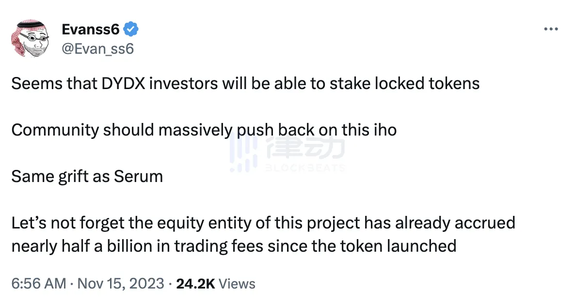 除此之外,@Evan_ss6 也表示DYDX 的投资者将能够质押锁定的代币。他呼吁「社区应该大力反对此提案,与 Serum 相同的欺诈手法。我们不要忘记,该项目的股权实体自代币推出以来已经积累了近 50 亿美元的交易费用。」