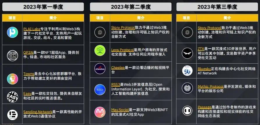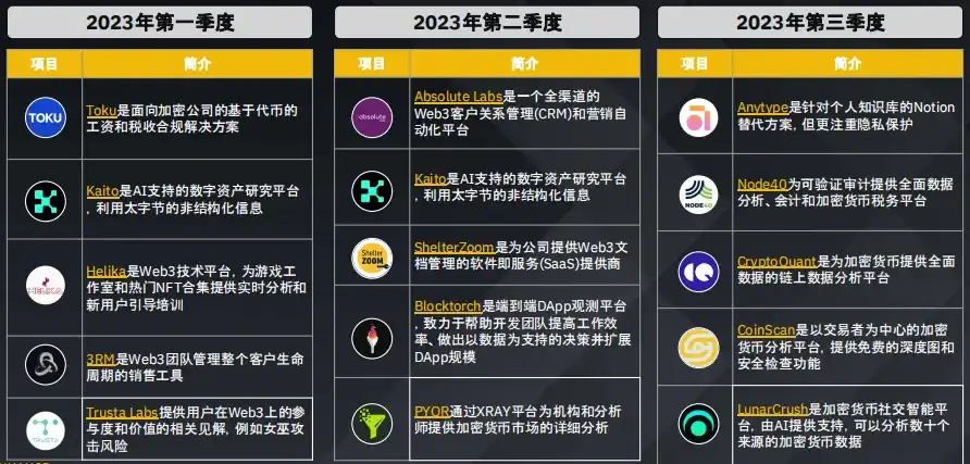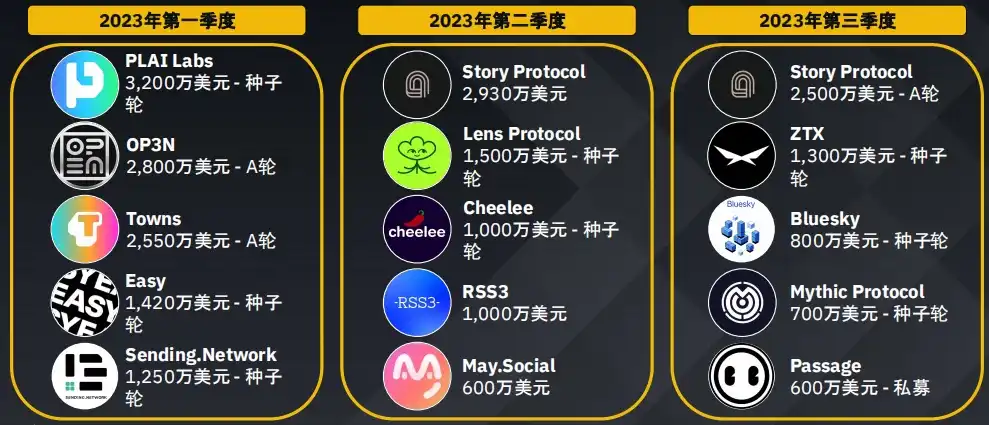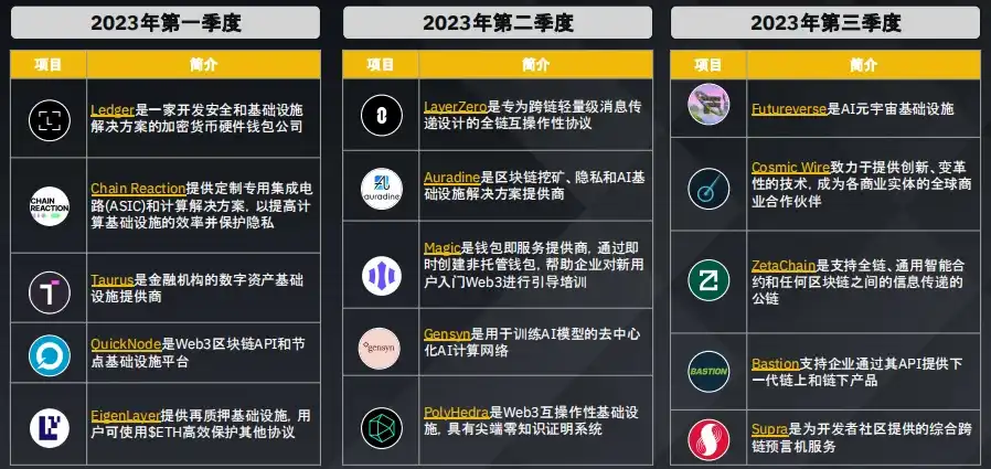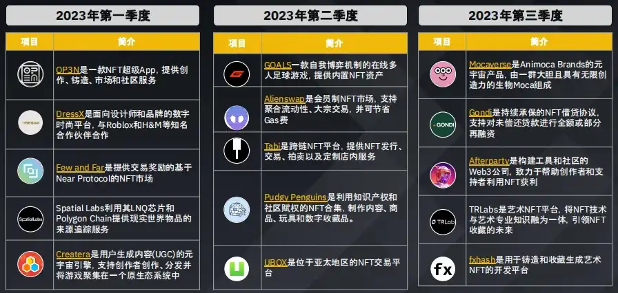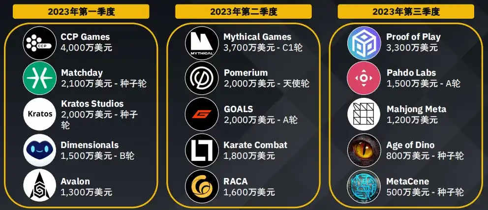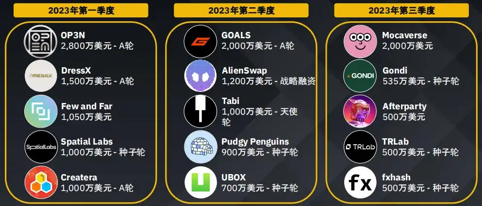 游戏领域持续吸引风险投资的兴趣,这表明人们对这一新兴领域充满期待,最近几个季度人工智能和数据领域的获投也有所上升。2023 年第三季度主要转向了包括 DEX 在内的四大板块。