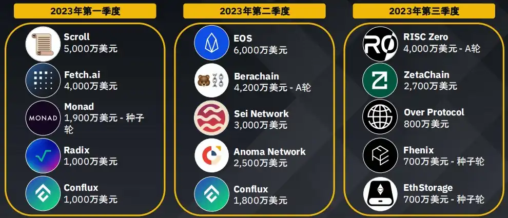 · 上个季度的种子轮融资占比飙升至 47.9% 。尽管总体交易数量有所下降,但种子轮项目在 2023 年第二季度到第三季度之间从 77 个增加到 81 个。
