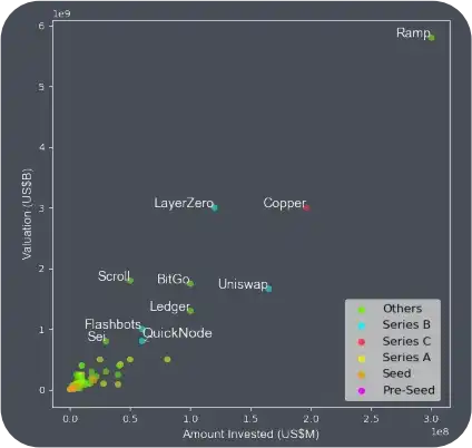· 支付解决方案 Ramp 以 58 亿美元估值位居榜首。紧随其后的是全链互操作性协议 LayerZero 以及专注于机构的基础设施项目 Copper 均估值 30 亿美元。
