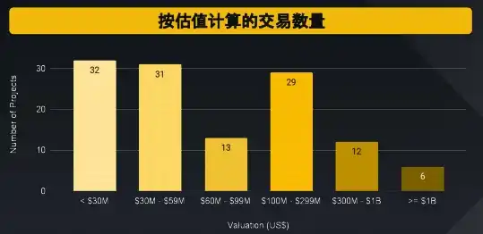 · 3, 000 万美元以下、 1 亿美元至 2.99 亿美元、 3, 000 万美元至 5, 900 万美元这三个估值等级的项目数量相近。