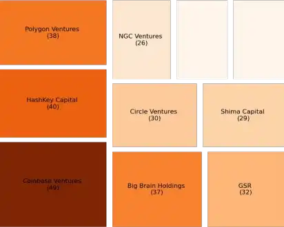 · 该图显示,Polychain Capital 和 Coinbase Ventures 的 共同投资数量最多(40 宗)。这可能是因为 Polychain 的创始人 Olaf Carlson-Wee 曾是 Coinbase 的首席风 险官。