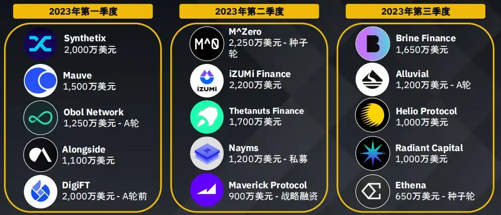 · 收益板块只有 10 宗融资交易,但其平均融资额最高。这主要是因为一家专注于资产管理的中心化金融企业 Amber Group 获得了 3 亿美元的 C 轮融资。
