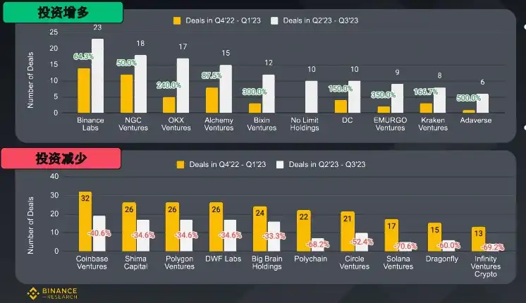 尽管市场环境艰难,但 Binance Labs 和 NGC Ventures 等风投公司仍表现出看涨情绪,投资数量增多。Binance Labs 的绝对投资数值增幅最大,近两个季度共计 23 宗投资。
