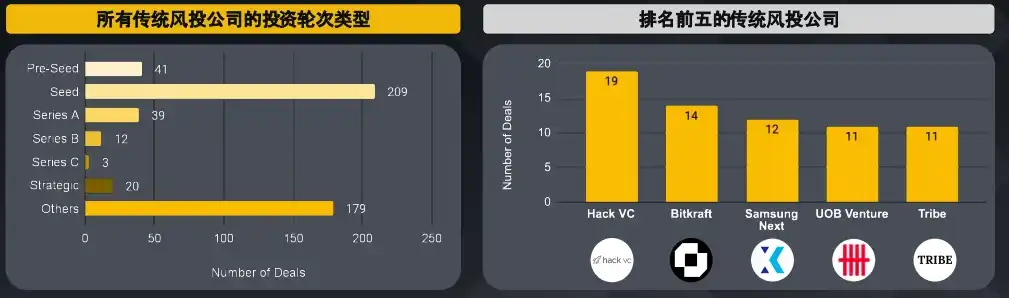 · 所列出的前五大传统风投公司中,只有 Bitkraft 主要专注投资游戏。HackVC 的交易数量最多,并将投资分散到从游戏到基础设施等多个领域。项目包括混合衍生品交易平台 GRVT 和利用贡献度证明机制的 GameFi 平台 DeGame 。