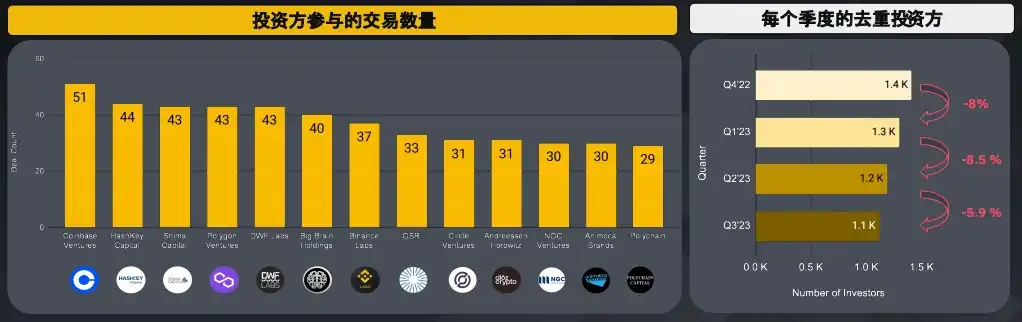 近四个季度,Coinbase Ventures 的交易数量位居榜首,其中 33.3% 流向 DeFi,另有 39.2% 投资到基础设施。 DWF Labs 是新晋入榜的投资方,从 2022 年 10 月才开始其投资活动。此外,尽管每个季度的去重投资方的数量都有所减少,但上个季度的降幅放缓至 5.9% 。