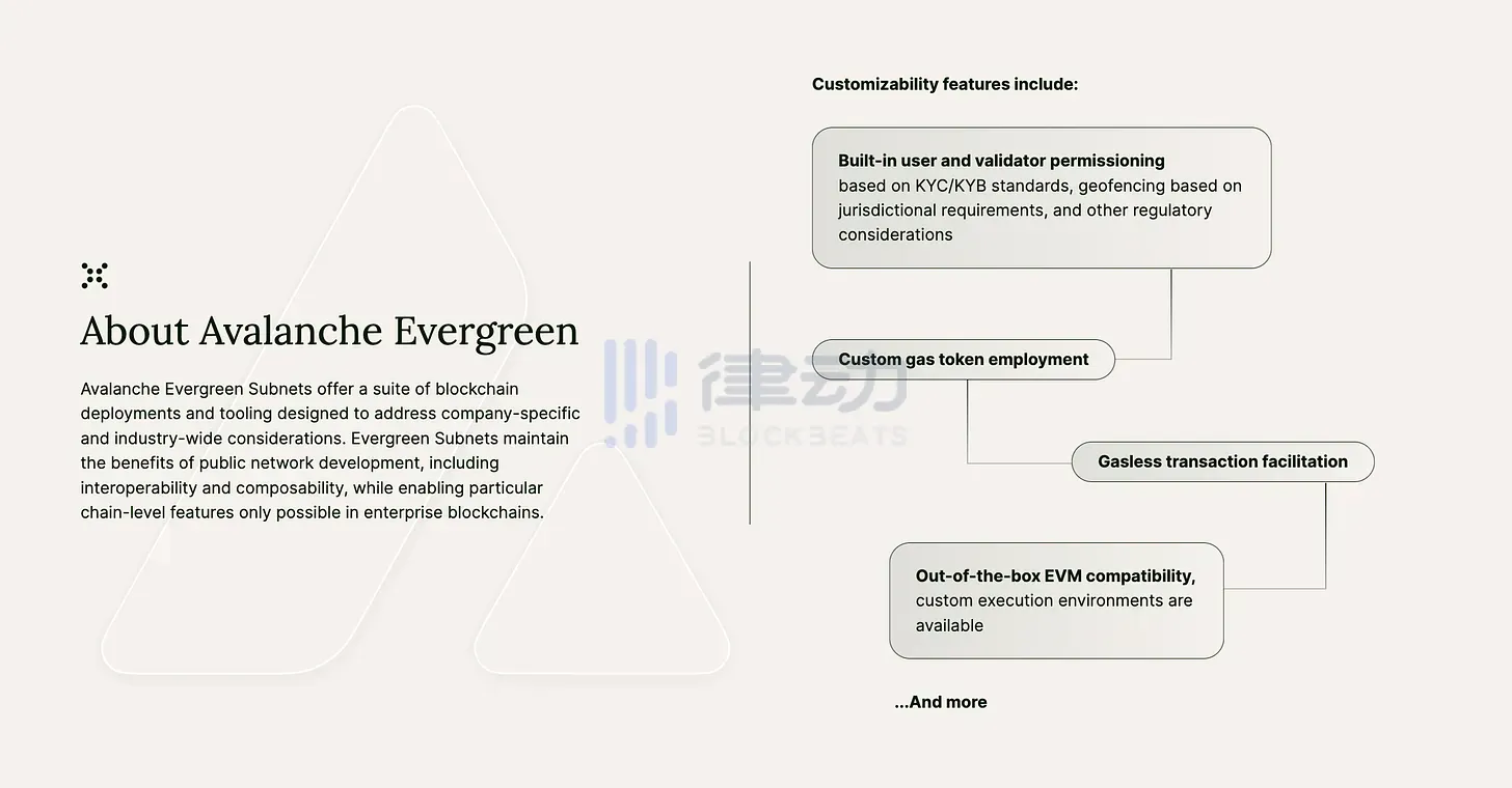 与摩根大通 Onyx 进行连接的 Avalanche Evergreen,是 Avalanche 今年 4 月专门部署的、为机构所用的子网。据悉,该子网将是一套专门为金融服务设计的机构区块链部署服务和工具,机构可启动自己的 Evergreen 子网用于研发和「生产就绪用例」,并可以在私有的、许可的链中与已知和批准的交易对手一起实施区块链战略,同时保留通过 Avalanche 的本地通信协议 Avalanche Warp Messaging (AWM) 与其他子网通信的能力。