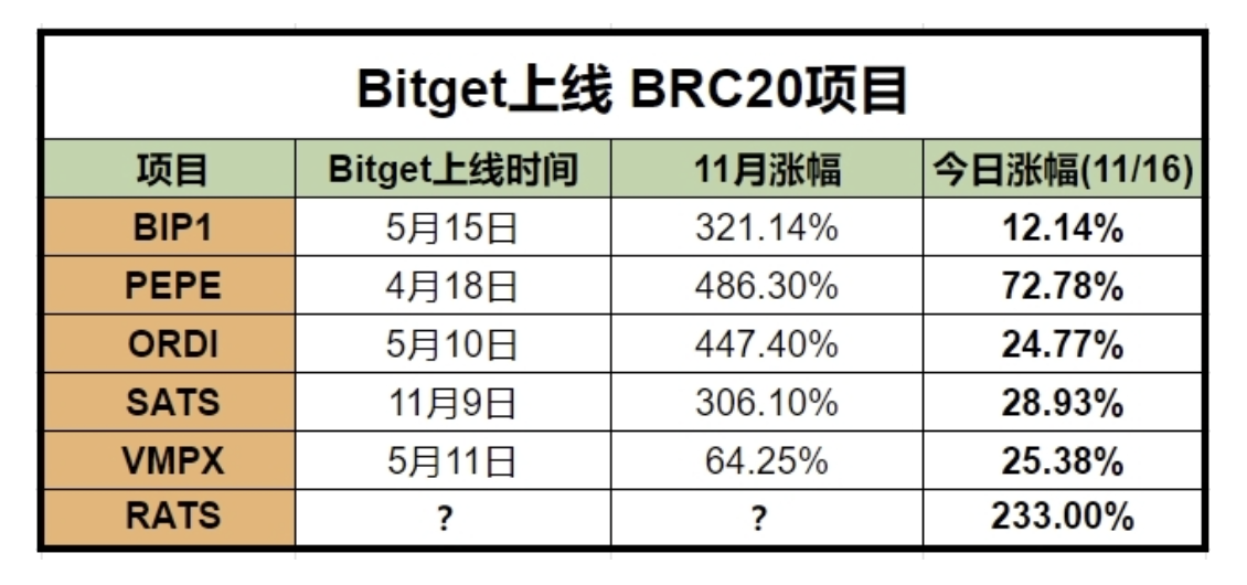 而进入 11 月以来,随着加密市场的回暖,比特币生态代币开始集体走强。以 BRC20 代币为例,11 月的平均涨幅超过了 300%。而其中表现最为亮眼的 RATS,PEPE 和 ORDI,整个 11 月份分别上涨了 774%,486% 和 447%。而在 4 月份就上线多个 BRC-20 代币的 Bitget,也帮助其用户稳稳地踩中了这波风口。