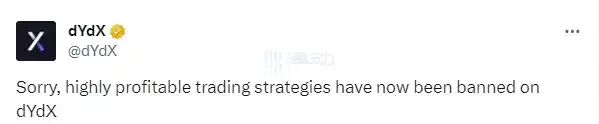 11 月 19 日,据官方消息,dYdX 宣布已禁止高盈利交易策略。 此前今日早些时候,dYdX 创始人 Antonio Juliano 在社交平台发文表示,推出了一系列关于 dYdX 的更新,内容包括: · 市场更新将变得更容易,使市场更易于产生更高的流动性; · 维持保证金功能将变得可更新(V3 中没有); · 维持保证金功能将能够随头寸大小变化(V3 中没有); · 清算引擎会重新设计; · 如果账户存在任何负资产,将不会受理提款需求(直到相关头寸被清算)。