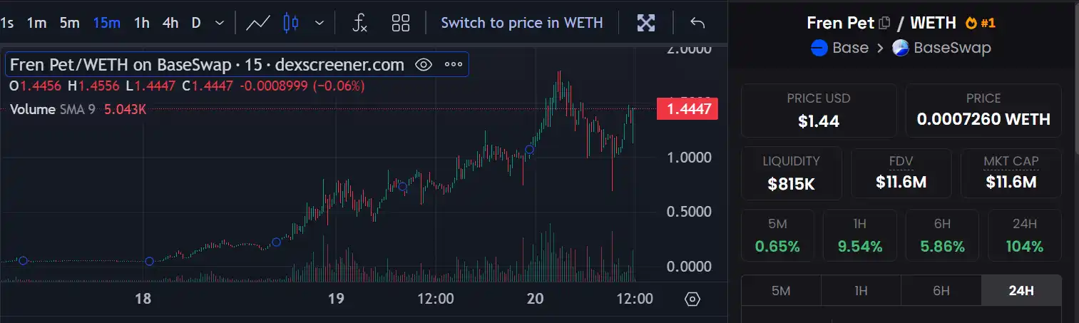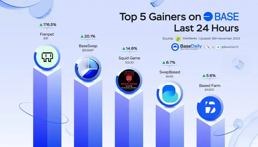 11 月 18 日,Fren Pet 被 Coinbase 和 Base 官方推特宣传后,引起了社区的普遍关注,其代币涨幅在当日的 Base 生态中排名第一。