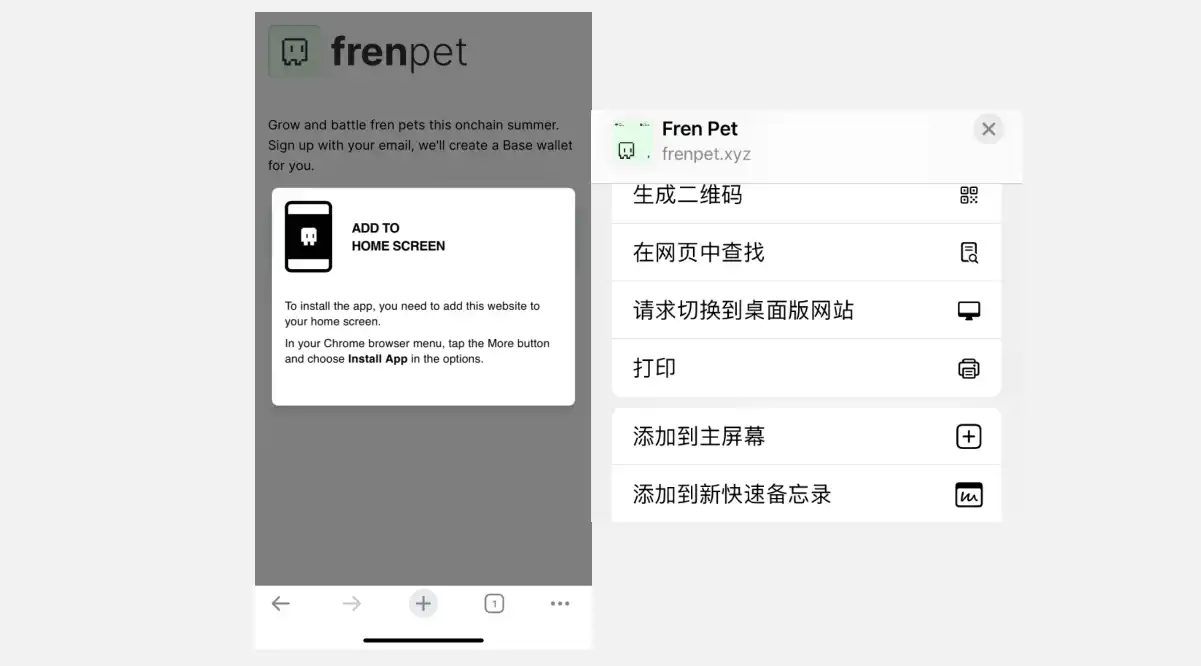 在 Chrome 浏览器中进入Fren Pet 网址,点击「共享」图标,在选项中选择 "添加到主屏幕"。然后在主屏幕上打开 Fren Pet。