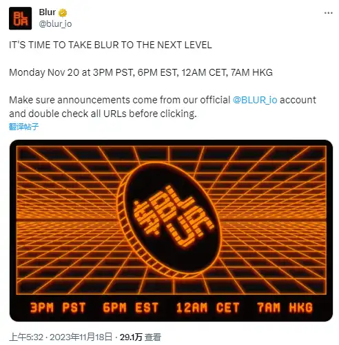 Blur 将于北京时间 11 月 21 日 7 时发布一个「将 Blur 提升到新水平」的重要消息。此前 Blur 官方曾于 10 月发文暗示 Season 2 将于 11 月 20 日迎来重要节点。