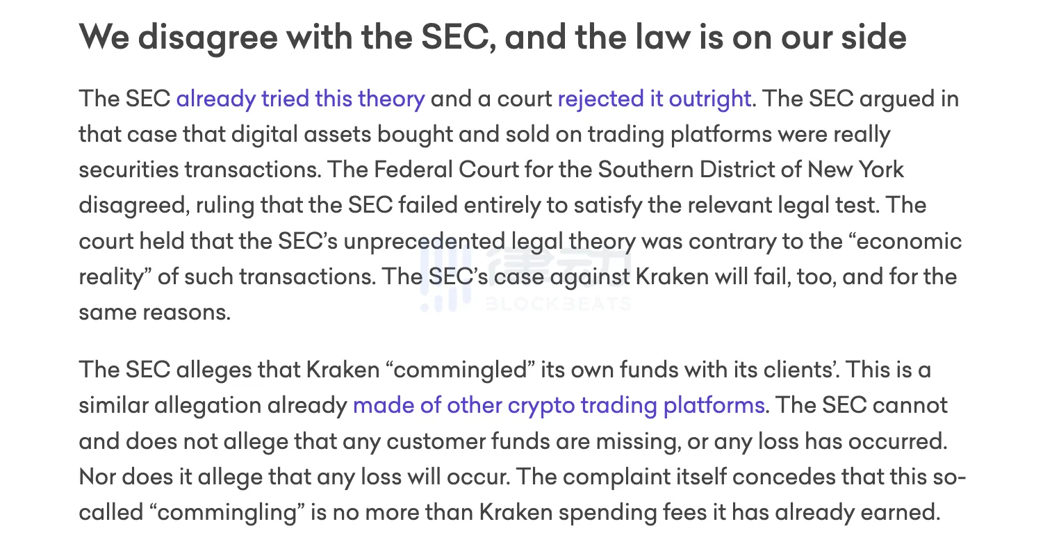 本次 Kraken 的回应,针对的是 SEC 昨日最新的指控。
