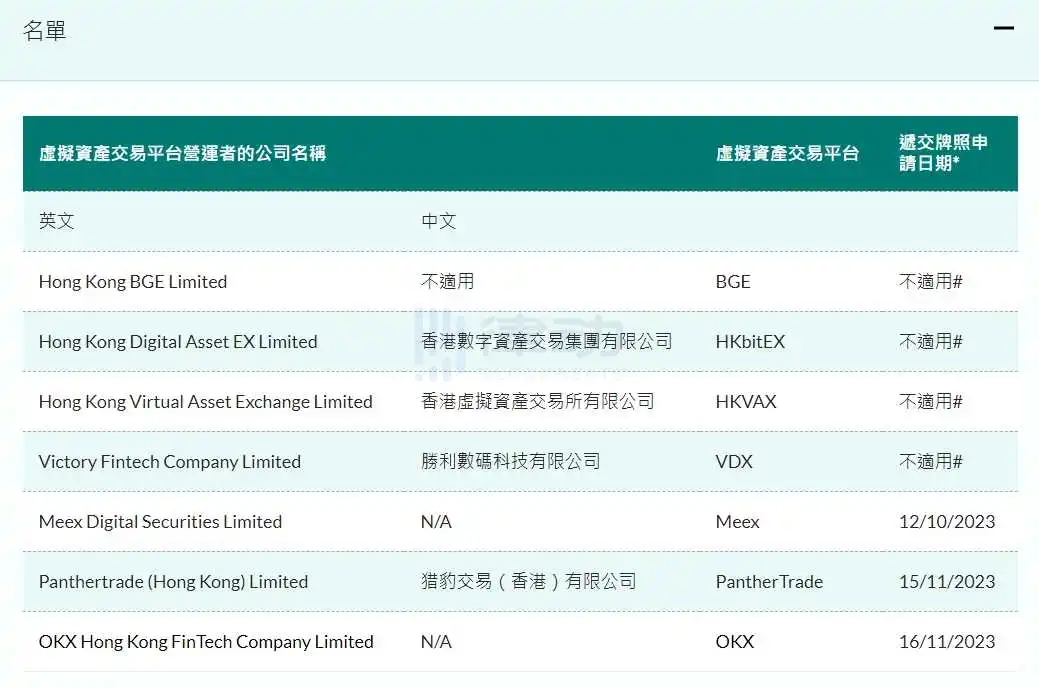 香港证监会官方网站更新虚拟资产交易平台申请者名单,OKX Hong Kong FinTech Company Limited 已于 11 月 16 日递交虚拟资产交易平台牌照申请,据悉旗下虚拟资产交易平台名为「OKX」。