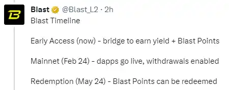 此外,Blast 的诞生始于投资者在 Blur 上的收益需求,今日早些时候,Blur 宣布已开放第 2 季空投申领,并开启为期 6 个月的第 3 季空投。创始人 Pacman 在介绍 Blast 时表示,Blast 正在为 Blur 的第 3 季空投提供动力,「自动生息」的策略无疑会为 Blur 带来更多的用户和流动性。