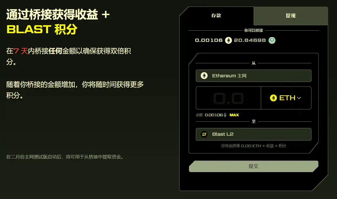 虽然 Blast 已经做好基础设施的建设,但 dapp 的开发仍处于非常早期的阶段,参与生态仅有「桥接资金进入」这一种玩法,7 日内桥接资金将获得双倍积分,但提取资金还需要等到明年 2 月主网上线后开放,而 dapp 上线要等到主网启动之后(也许会提前到测试网时)了。
