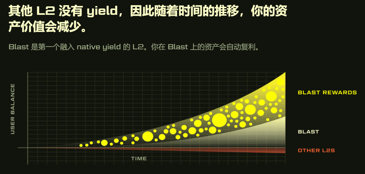 Blast 认为,现有 Layer 2 的基准利率为 0%,在默认情况下,用户的资产价值会随着时间的推移而贬值,而在 Blast 上,用户的余额会自动复利,并额外赚取 Blast 奖励。