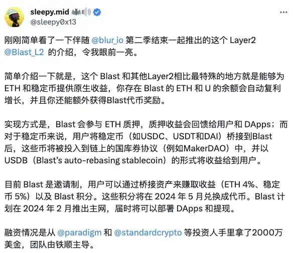 值得注意的是,Blast 由 Blur 创始人 Pacman 创立,Paradigm 以及 eGirl Capital 这两家资方在亦是 Blur 于 22 年 3 月种子轮时的领投方和参投方。