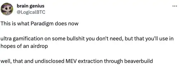 也有人并不买账 Blast 的构想,投资者 brain genius 认为,Paradigm 把社区不需要的功能进行「游戏化」,人们只会为了空投而参与。