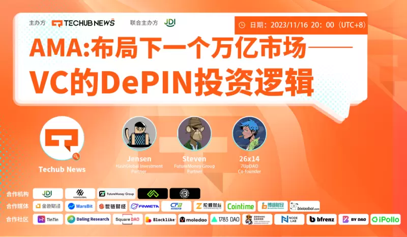 本期Twitter Spaces Techub News联合JDI Global,特别邀请HashGlobal Investment Partner Jensen、FutureMoney Group Partner Steven和7up DAO Co-founder Nathan(26x14),共同就《布局下一个万亿市场——VC的DePIN投资逻辑》这一主题展开讨论,并详细解读DePIN的发展趋势。
