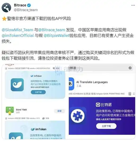 Bitrace 发推称,慢雾与 Bitrace 团队发现,中国区苹果应用商店出现假 imToken 与假 BitpieWallet 钱包应用,目前已有受害人产生资金损失。Bitrace 称,疑似盗币团伙利用苹果应用商店审核不严,通过购买关键词排名的形式为假钱包下载链接引流,请投资者务必注意此类风险。