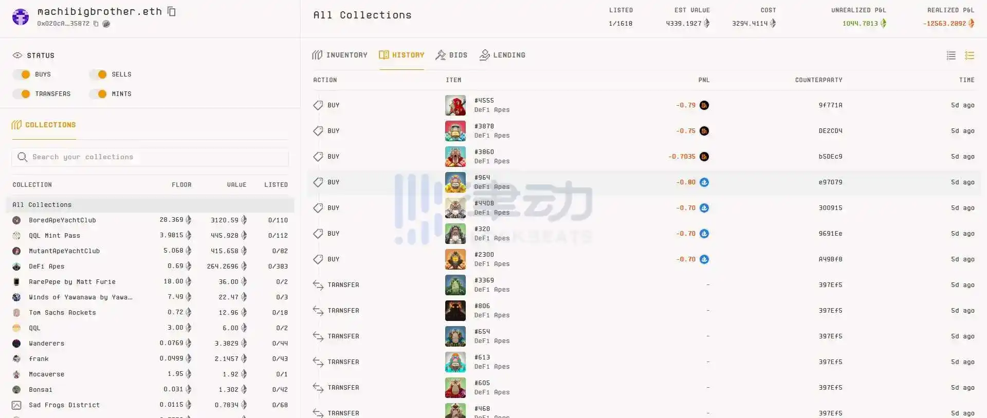 据 Blur 页面信息,黄立成在 Blur 交易 NFT 累计已实现亏损达 12,563.2892 枚 ETH(价值约合 2512.6 万美元),未实现利润为 10,44.7813 ETH。另根据 Dune 信息,黄立成地址在 Season 2 空投中可领取 600 万枚 BLUR(价值约 190 万美元)。