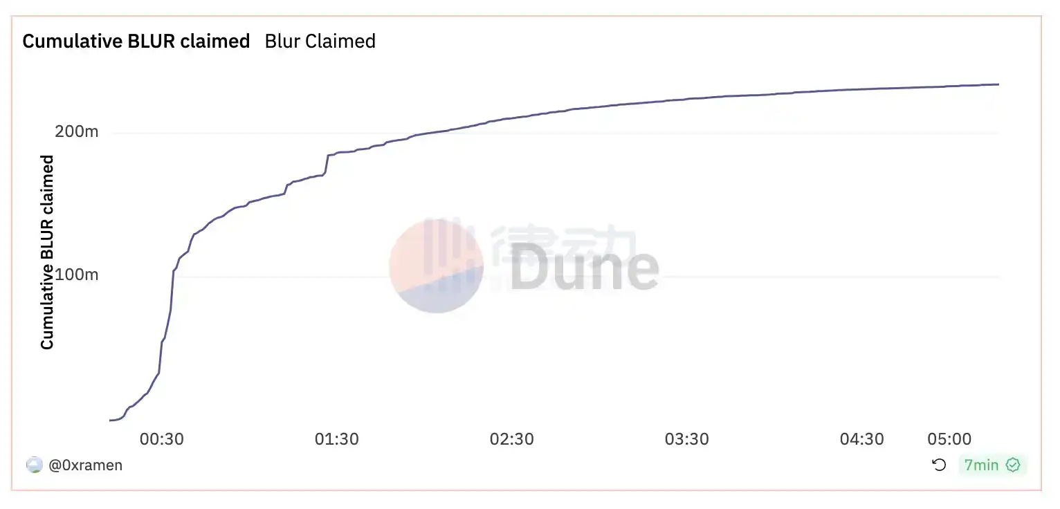 据 Dune 数据,当前已有逾 2.34 亿枚 BLUR 代币被申领,占 Blur 第 2 季空投总量 3.076 亿枚 BLUR(价值约 9750 万美元)的 78%。