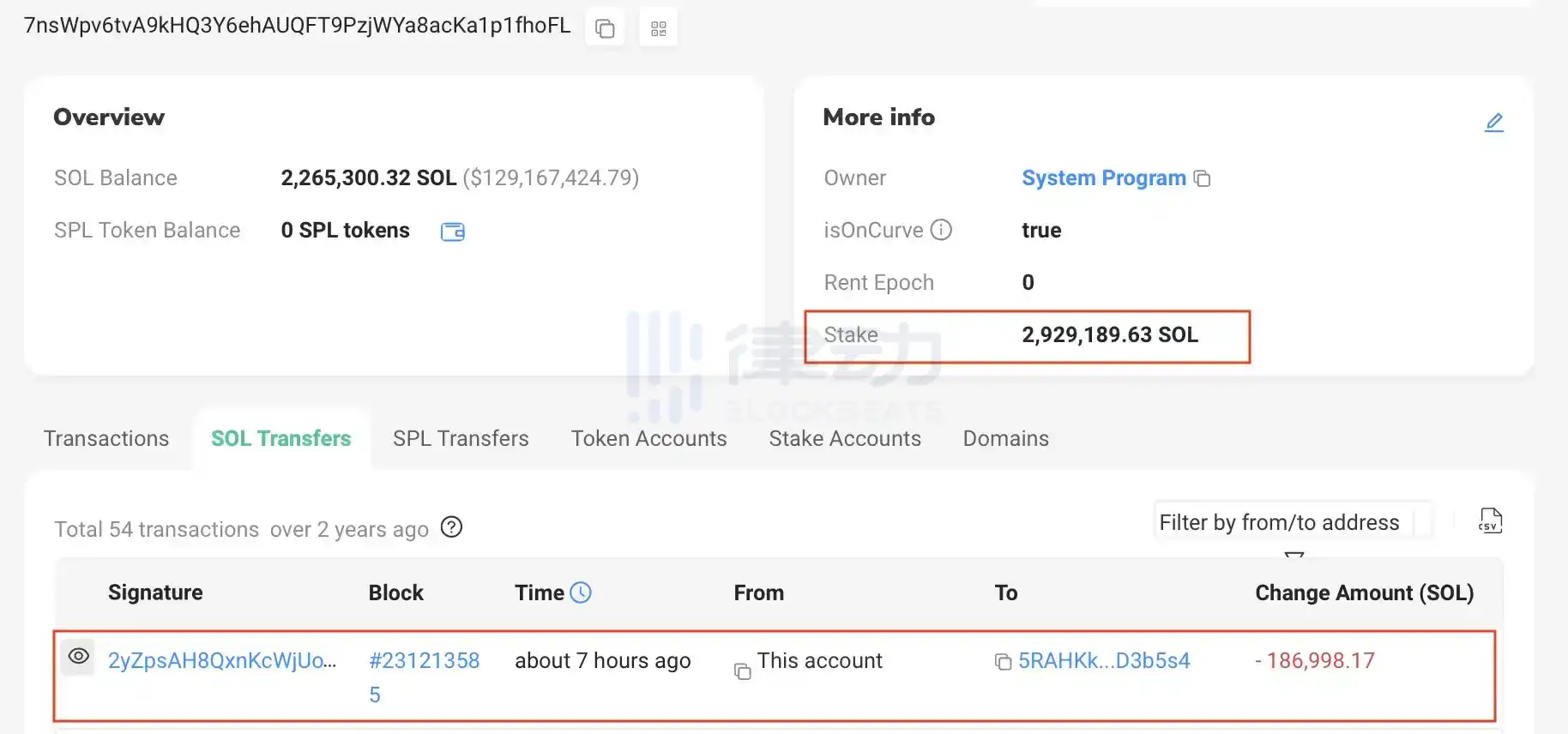 据派盾 PeckShieldAlert 监测,某 7nsWpv 开头 SOL 巨鲸地址于 7 小时前将 18.7 万枚 SOL 发往 Binance,但仍持有约 293 万枚在质押中。