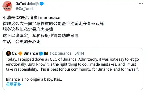 加密 KOL 0xTodd:不清楚 CZ 是否追求 inner peace。管理这么大一间全球性质的公司甚至还游走在某些边缘,想必这些年必定是心力交瘁。这下尘埃落定,某种程度也算是功成身退,生活上会更加开心吧。
