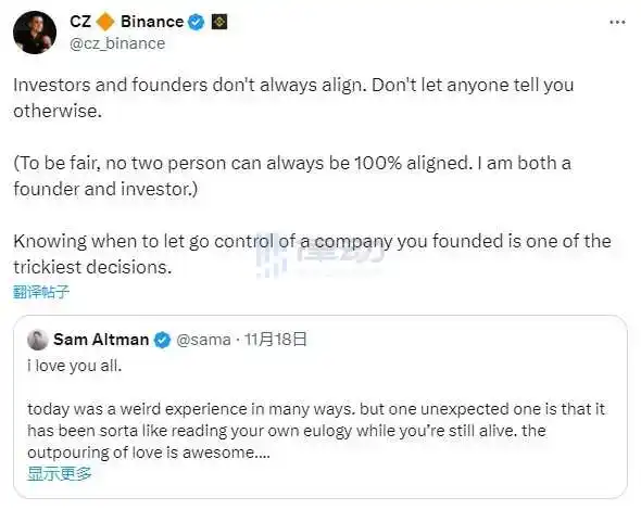 CZ 两天前在评论 OpenAI 和 Sam Altman 事件的相关推文中表示,「知道何时放弃自己创办的公司的控制权是最棘手的决定之一」。