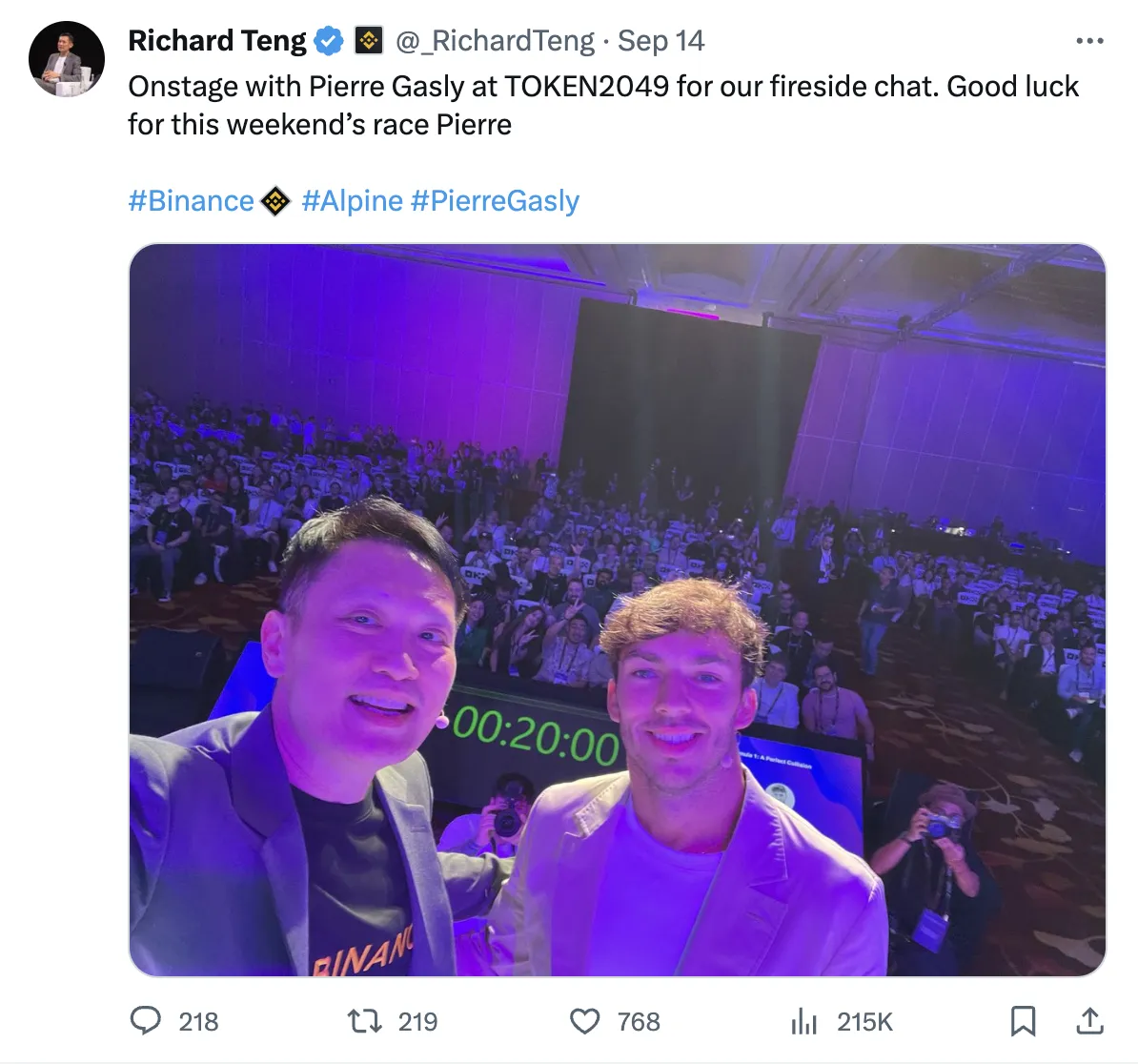 2023 年 9 月,Richard Teng 在 TOKEN 2049 上代表 Binance 同知名 F1 赛车手 Pierre Gasly 会面,并进行圆桌会谈。