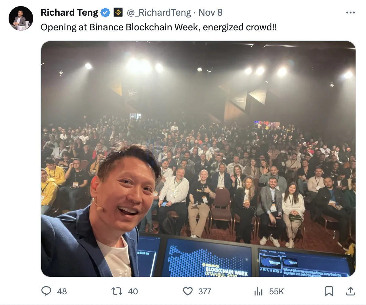 另据彭博社报道,Binance 创始人 CZ 同意辞职并认罪,且不再担任 Binance 执行职务。CZ 随后在 X 上发表推文,宣布 Binance 全球区域市场负责人 Richard Teng 接任 CEO 一职。CZ 在文中指出,Richard Teng 将凭借其三十年金融服务和监管经验,引领 Binance 进入下一个增长阶段,确保公司在安全、透明、合规和增长方面的发展。