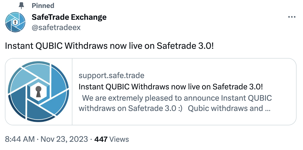 在社区出现众多质疑声后,SafeTrade 在官方 Discord 发布公告称,虽然平台更新耗时略长,但现已接近完成,主要钱包即将全面恢复服务,并将陆续恢复更多服务。随后,SafeTrade 于今日在官方推特宣布许宣布恢复 $QUBIC存取款服务。