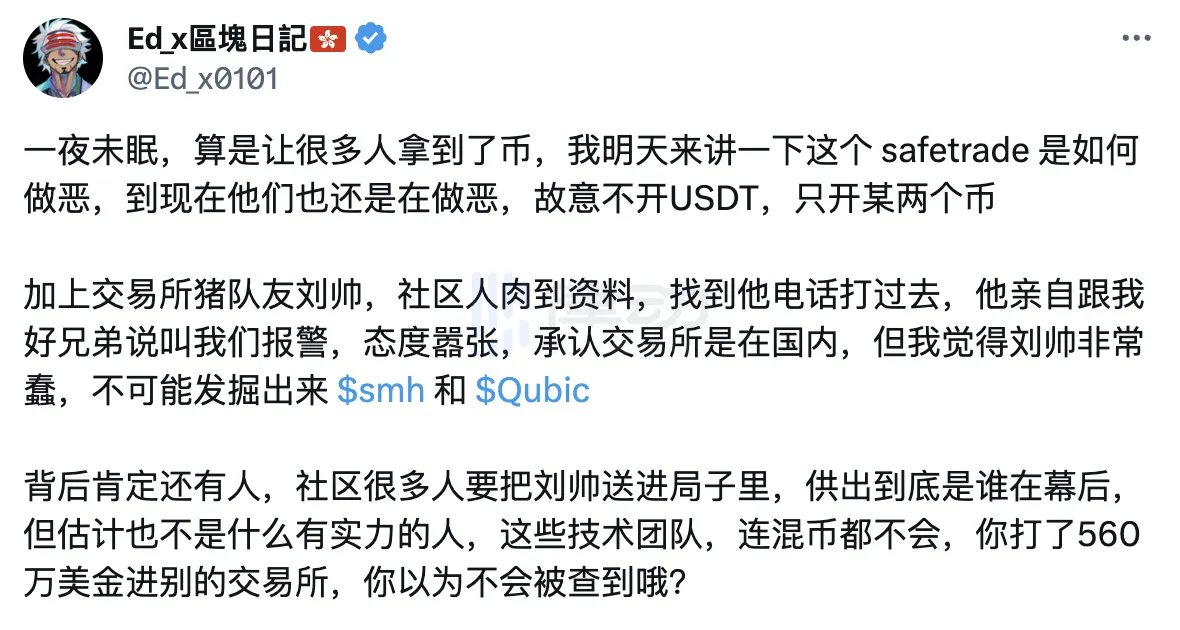 例如,Ed_x 區塊日記(@Ed_x0101)在社交平台中附上了疑似 SafeTrade 地址的交易记录,并表示 SafeTrad 将「用户 90% 的 USDT 提走」了。