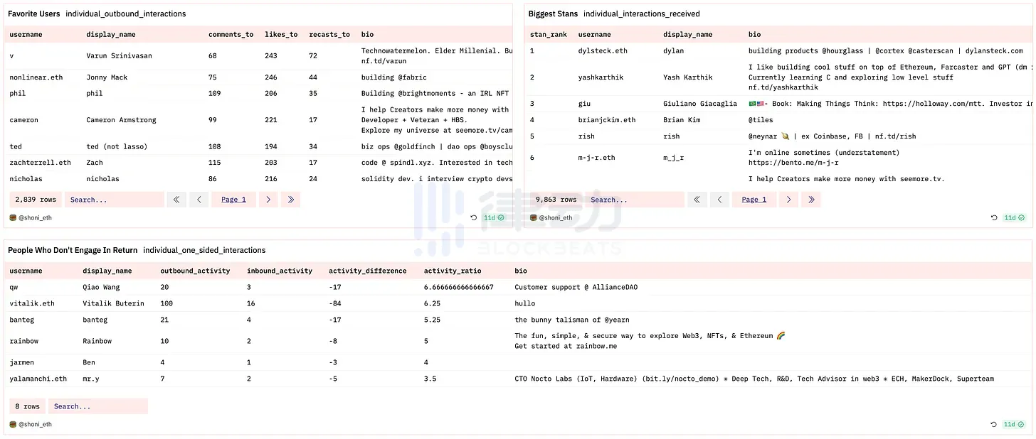 可以看到一些很有趣的细节,比如账户的最忠实粉丝、最喜欢的用户,以及不回应的用户(单方面的用户)。对于 Dan 来说,Qiao Wang 和 Vitalik 看起来并没有积极回应他。