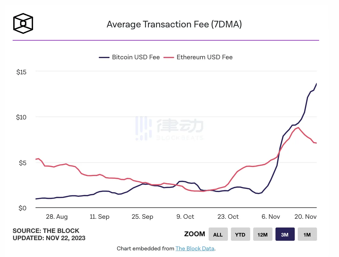 据 The Block 的数据仪表板,比特币的 7 天平均交易费用已经超过了以太坊。比特币的平均交易费用也一路走高,从 11 月 12 日的 8.59 美元上涨到 11 月 19 日的 12.75 美元,涨超了 48%。