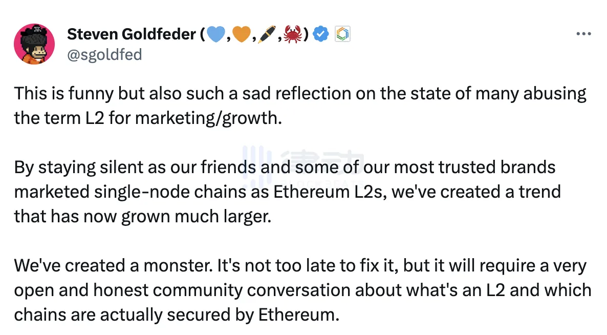 「我们的朋友和一些最信任的品牌将单节点链宣传为以太坊 Layer 2 平台时保持沉默,我们已经创造了一个如今变得更为庞大的趋势。现在修复它还不算太晚,但这需要一个非常开放和诚实的社区对话,讨论什么是 Layer 2,以及哪些链实际上是由以太坊保护的。」