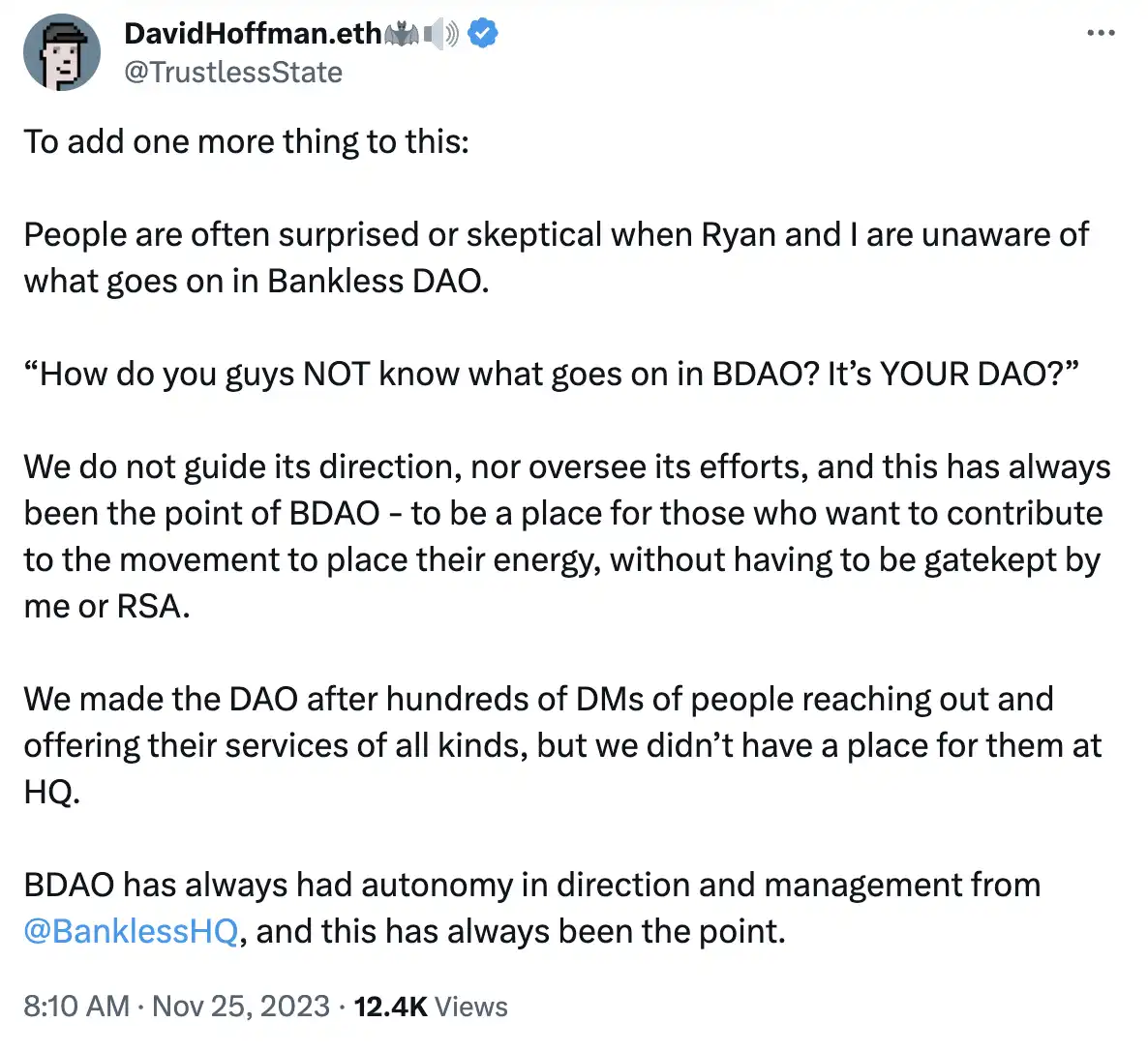 或许正是因为受到多位社区成员及社交平台用户的询问,Ryan 和 David 接连发表动态,澄清与 BanklessDAO 的关系。