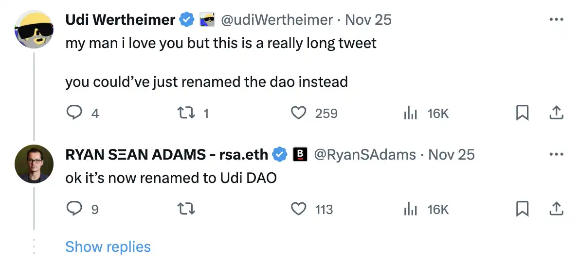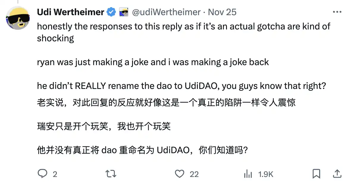 在 Ryan 发表的长文下方,Udi 风趣地评论指出:「你要不直接重新命名 DAO」,Ryan 风趣地表示「好啊,要不就改名为 Udi DAO」算了。