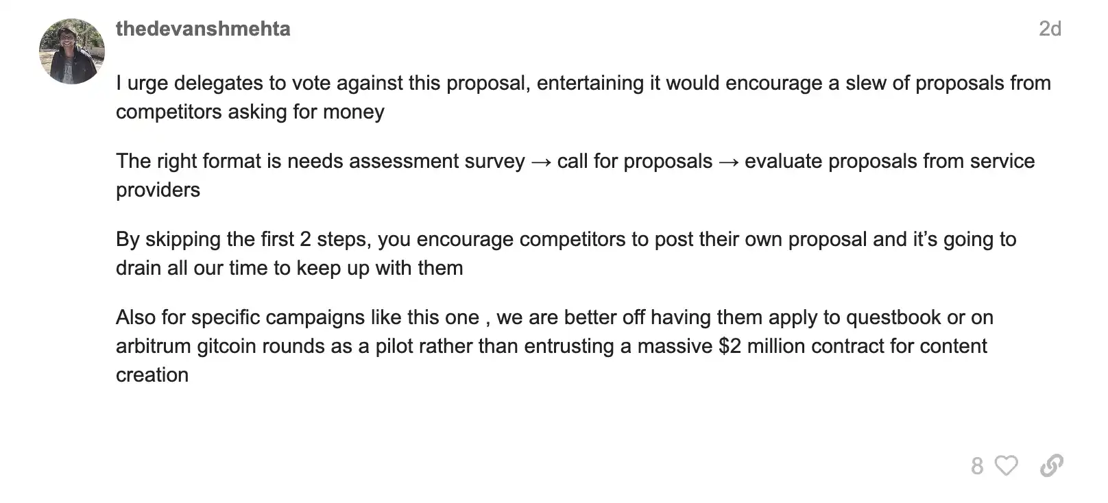 但这一提案引起了社区不少争议。有人指出,建议采取更具实验性的方法,即启动一个季度的试用期,而不是直接启动全年的活动;也有社区成员表示,如果通过该项提案,会鼓励竞争对手提出大量要钱的提案:「正确的格式是需求评估调查→征求建议→评估服务提供商的建议,通过跳过前两个步骤,您会鼓励竞争对手发布自己的提案,这将耗尽我们所有的时间来跟上他们的步伐。」
