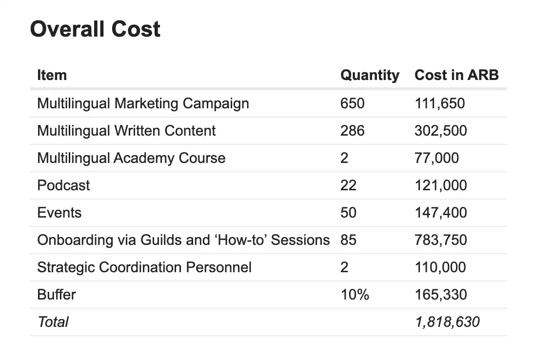 提案中还详细列出了每一项活动的成本,其中成本最高的项目为「通过公会和「操作方法」课程进行入职培训」,为 783,750 枚 ARB。