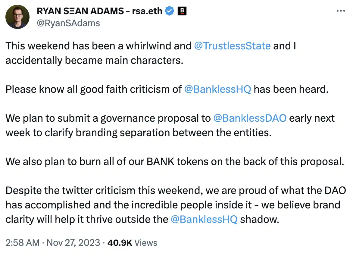 但事实上,针对 BanklessDAO 和 Bankless 之间名字相似可能会带来的更大的误解,Ryan 在社交平台表示将会在下周向 BanklessDAO 提交治理提案,还「计划根据该提案销毁所有 BANK 代币」,以免造成更大的误会和联想。