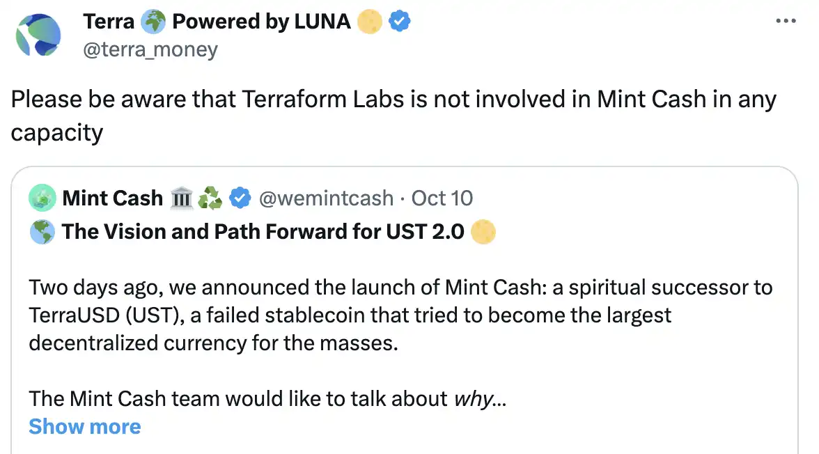 11 月 27 日晚 23 时许,Terraform Labs 官方在社交平台发文指出:「Terraform Labs 不以任何身份参与 Mint Cash。」