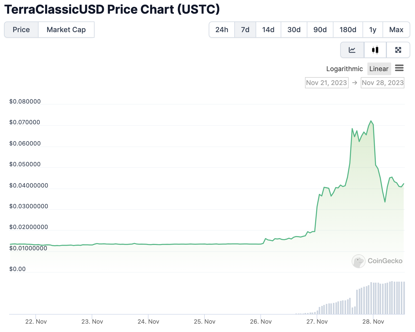 近三天来,USTC(Terra Classic USD)成为加密行业社区热议的对象。原因便是 USTC 突然开始暴涨,并于 11 月 27 日晚 23 时许,达到 7 日最高价格 0.072196 美元,7 日涨幅达 211.6%。