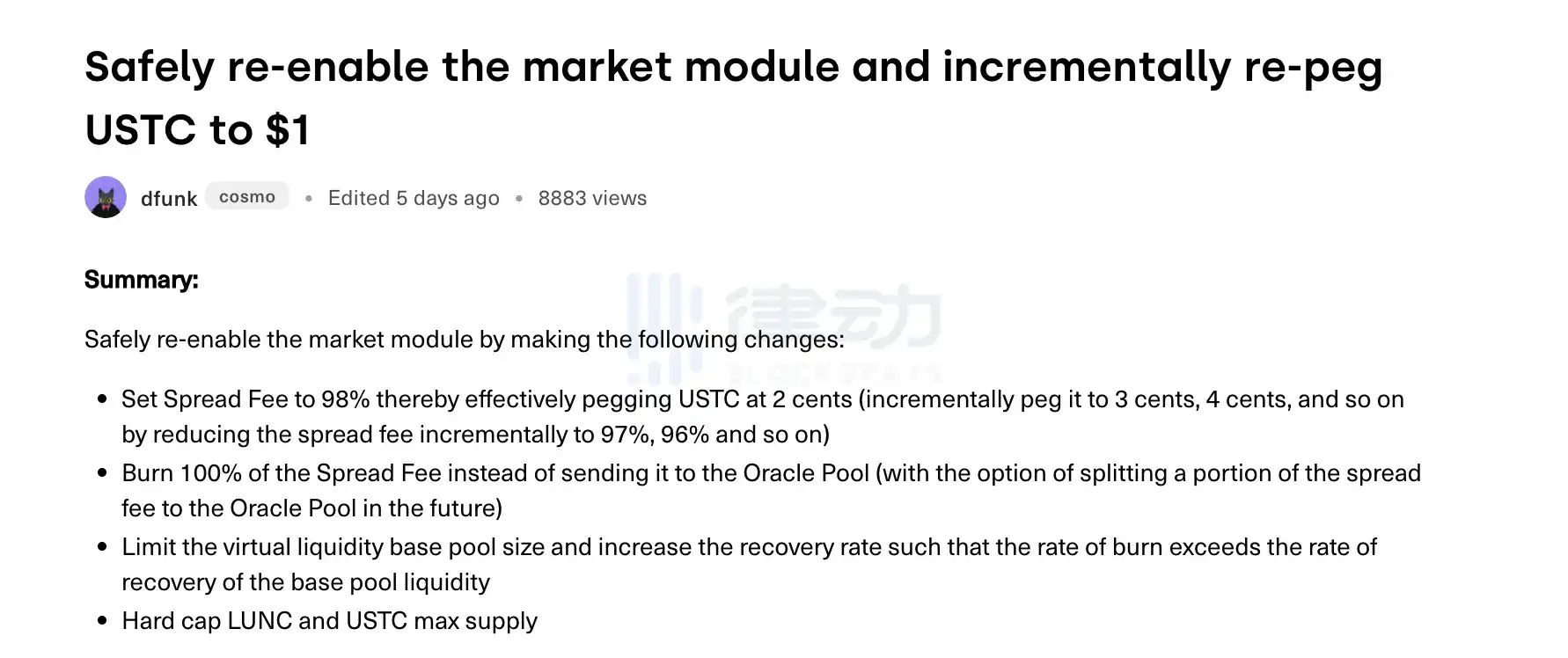 提案内容主要是通过重新启用市场模块逐步恢复 LUNC 与 USTC 的锚定中来。目前该提案并没有正式开启投票,仍在讨论阶段。