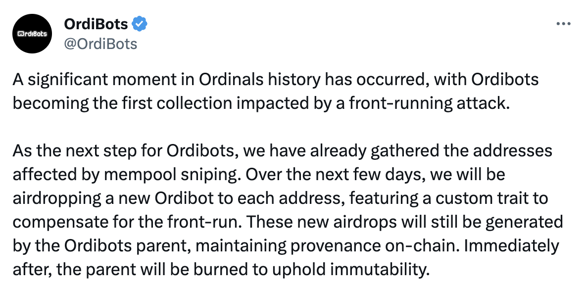 11 月 29 日上午,「第一个完全刻在比特币区块链上的交互式 3D AR Ordinals 项目」OrdiBots(@OrdiBots)在社交平台发文称,Ordibots 成为第一个受到抢先攻击(front-running)影响的项目。