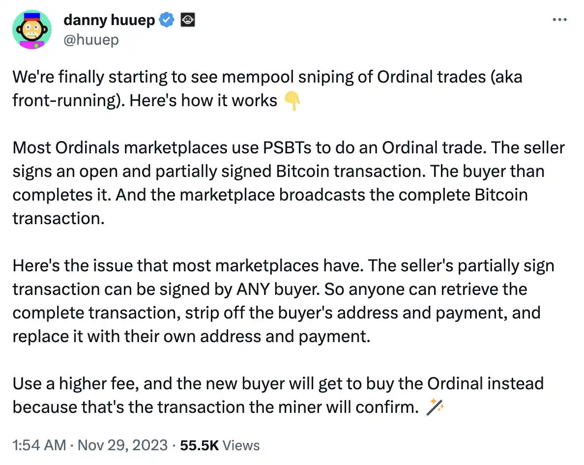 而解决问题的方法就是更换交易方式。对此,社区 KOL、Ordinals contributor DrJinglee(@ordjingle)也指出,这种聚集行为完全的绕过了 launch pad 的白名单设置而直接改在半路劫持了:「Ordibot 成为 Ordinals 历史上第一次遭遇大规模拦路抢劫的。」