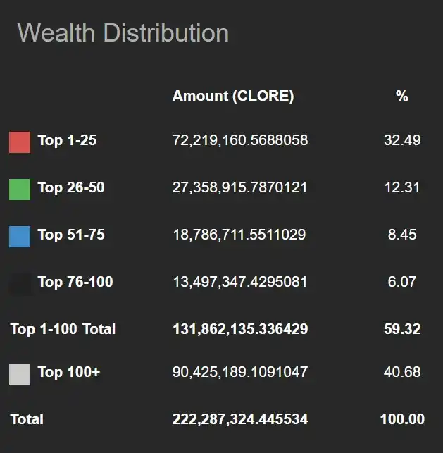 CLORE 属于 POW 代币,采用 kawpow 算法,与渡鸦币相同,抗 ASIC 挖矿。代币没有预挖和 ICO,每个区块的 50% 分配给矿工,40% 分配给出租者,10% 分配给团队。