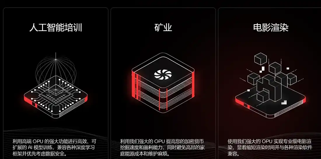 业务范围包括:人工智能培训、电影渲染、VPN、加密货币挖矿等。有具体算力服务需求的时候,完成网络分配的任务;如果没有算力服务需求的时候,网络找到当时挖矿收益率最高的加密货币,参与挖矿。