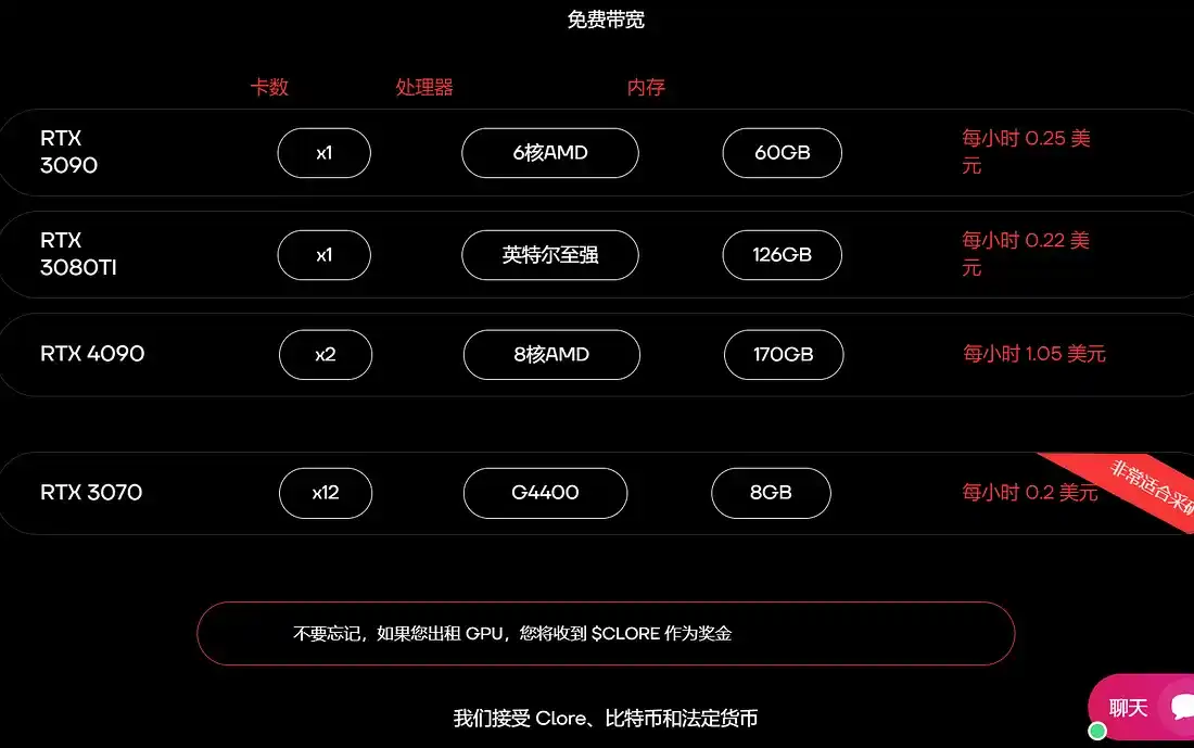 在官网上可以查看到具体 GPU 型号、配置、租赁价格等内容。提供算力的一方,可以获得 CLORE 代币作为奖励;服务器的性能越好,获得的奖励就越多。使用算力的一方,可以用 CLORE、BTC 或者美元支付。